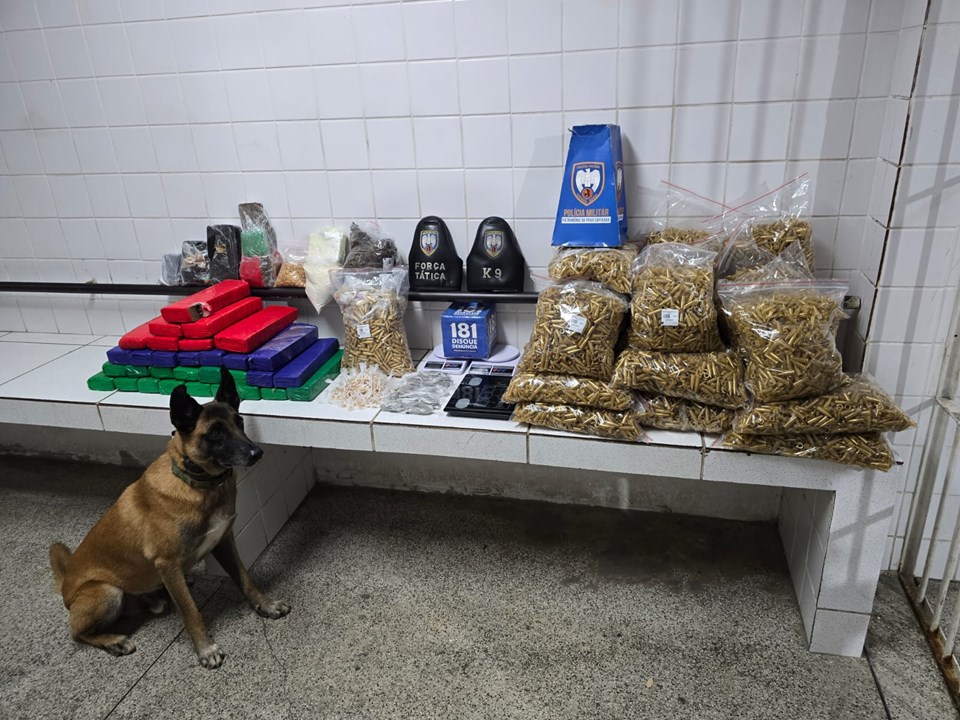No sábado (18), militares receberam informações oriundas do Disque Denúncia - 181 acerca de possível local no bairro São Diogo I utilizado para armazenamento, preparo e embalo de drogas. Diante das informações, as equipes prosseguiram ao local e realizaram a aplicação do cão farejador Apollo, que indicou de forma precisa pontos suspeitos, onde foi constatada a presença de entorpecentes e materiais relacionados ao tráfico.
