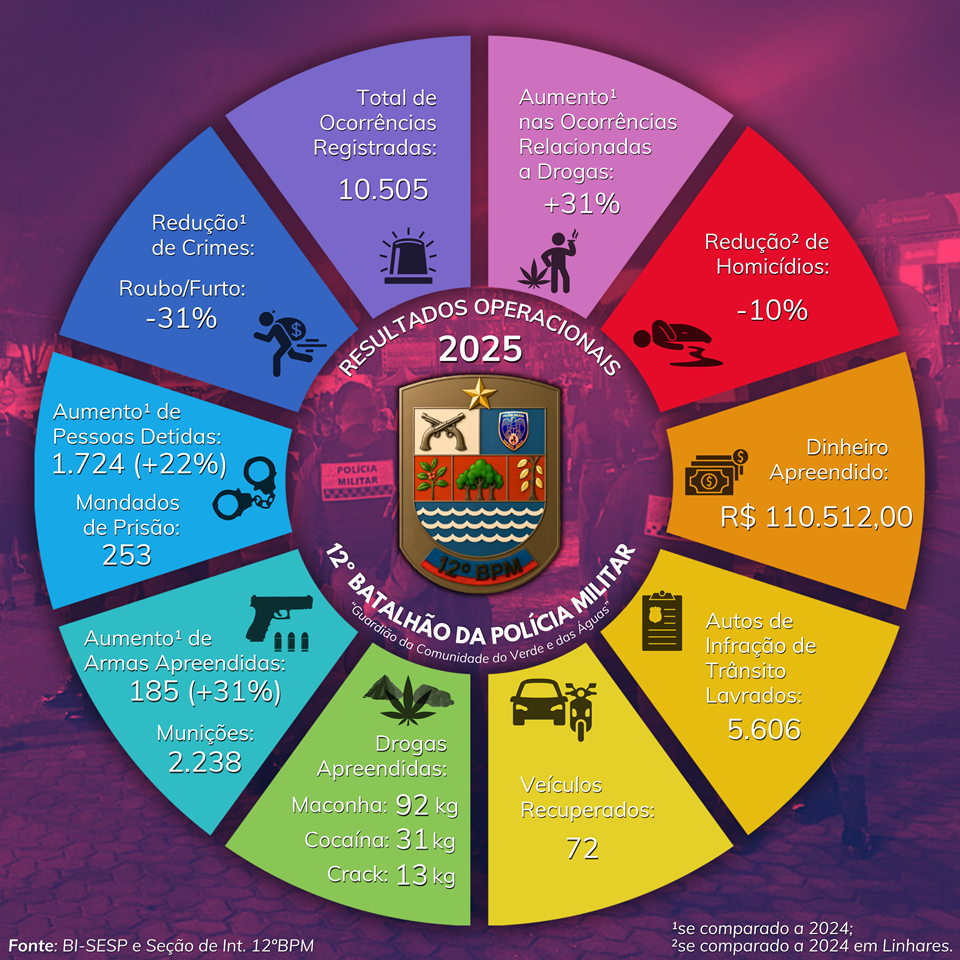O 12º Batalhão da Polícia Militar do Espírito Santo apresentou o balanço dos resultados operacionais alcançados ao longo do ano de 2025. Os dados demonstram avanços significativos nas ações de repressão qualificada, prevenção criminal e segurança viária nos municípios sob responsabilidade da Unidade.