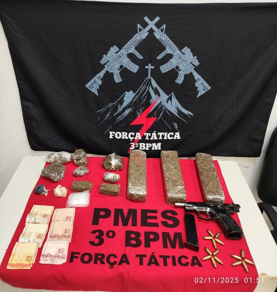 Na abordagem, foram encontrados R$ 289,00 em espécie, em notas miúdas e com odor característico de maconha. Durante as buscas, os militares localizaram uma pistola calibre 9mm, um carregador e 15 munições do mesmo calibre, além de três tabletes grandes, dois tabletes médios e seis porções grandes de maconha, uma bucha de haxixe pesando 20,96 gramas e uma porção média de crack pesando 21,79 gramas, totalizando aproximadamente 1,680 kg de maconha.
