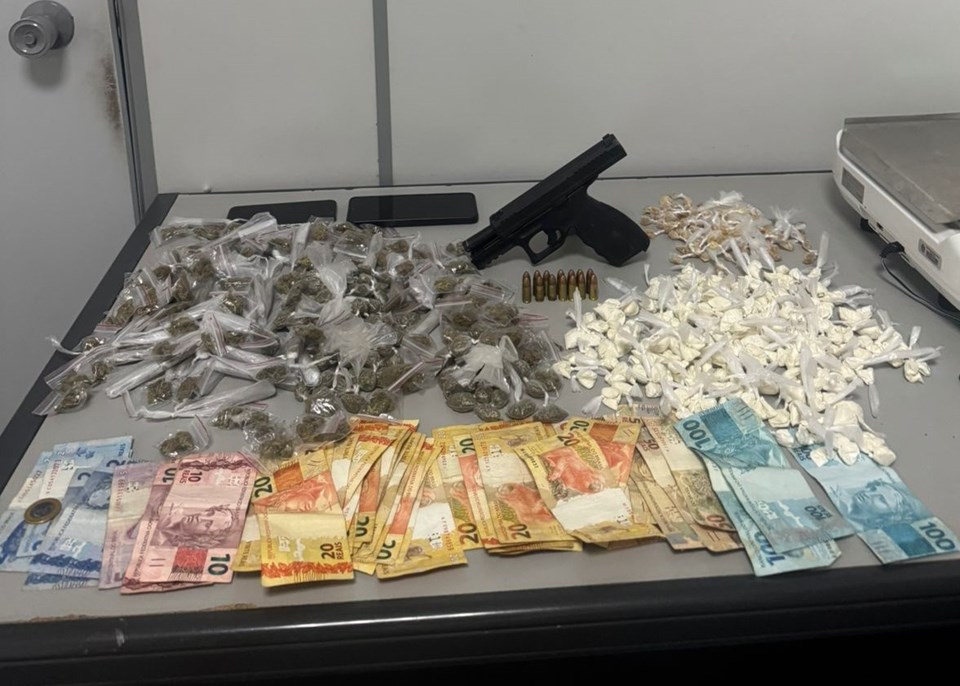 Durante a averiguação de denúncias anônimas nos bairros Santa Rita de Cássia e Serra Dourada II, militares obtiveram êxito em deter um suspeito e com ele apreender 48 buchas grandes e 112 buchas de maconha, 96 unidades de Skank, 90 pedras de crack, 215 papelotes de cocaína, além de uma pistola calibre 9mm, 14 munições do mesmo calibre, um carregador, R$ 1.216,00 em espécie e dois aparelhos celulares.