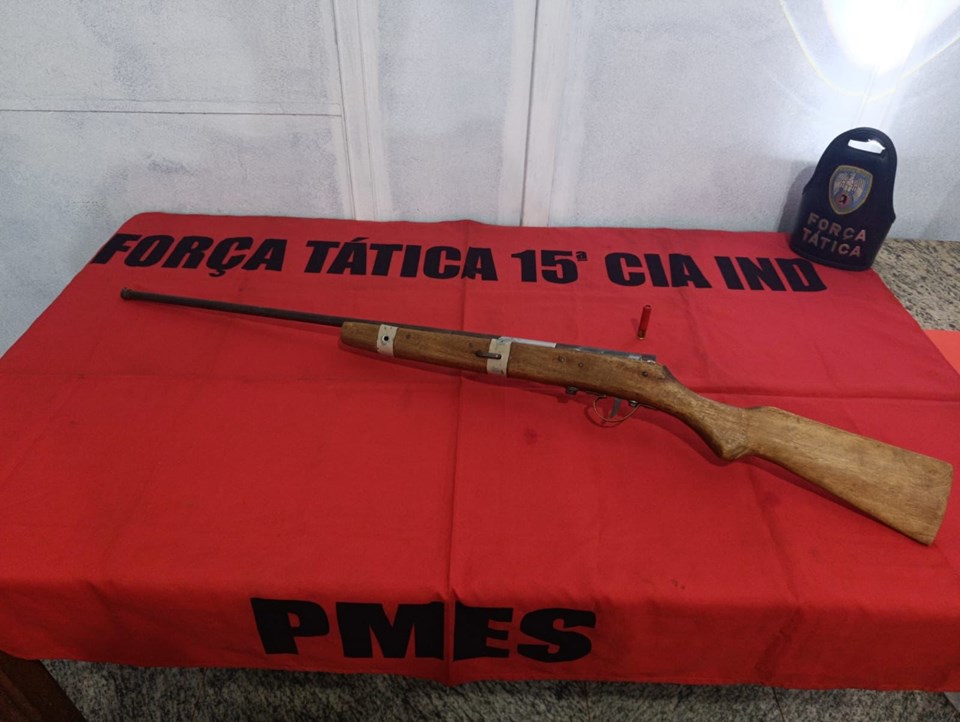 Durante as buscas, foi localizada uma espingarda calibre .36, juntamente com uma munição do mesmo calibre.