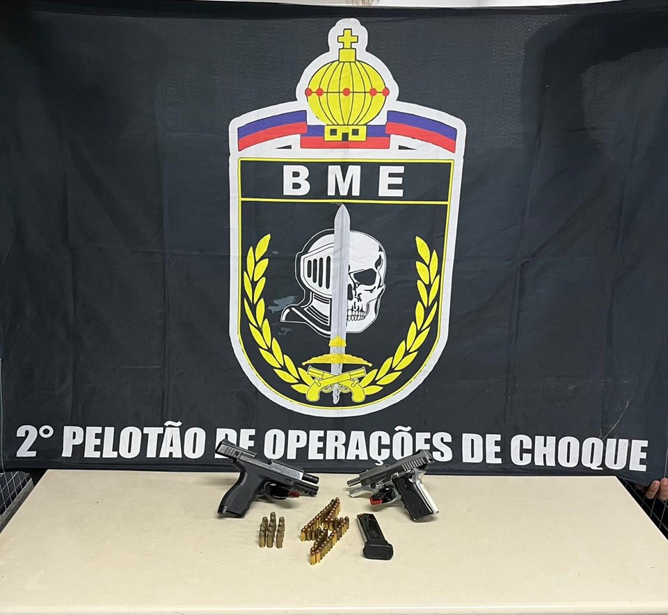 Durante o retorno ao quartel após patrulhamento, os militares receberam uma denúncia informando sobre um indivíduo armado nas imediações do bairro. Diante da informação, as guarnições prosseguiram imediatamente ao local e intensificaram o patrulhamento. Durante as diligências, foram apreendidas duas pistolas, sendo uma calibre 380, com 50 munições intactas, e outra calibre .40, com 13 munições intactas, além de um telefone celular. Um indivíduo foi detido.