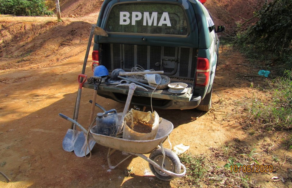 Continuando a fiscalização, a equipe encontrou uma área degradada de 900m² na mesma propriedade, onde estava sendo realizada uma extração de pedras preciosas. Os garimpeiros fugiram quando avistaram a viatura.