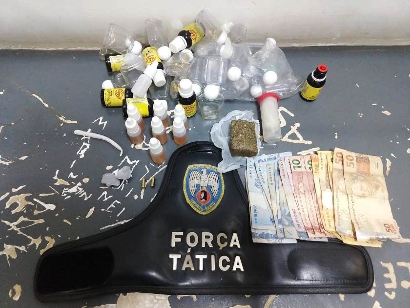 Os militares abordaram R. A. R. e J. P. de F. S., que resultou na apreensão de aproximadamente 56 gramas de maconha, três buchas e um cigarro da mesma substância, sete vidros de loló, além de sementes de maconha, duas cápsulas deflagradas CBC calibre 22, R$ 268,00 e outros materiais utilizados para preparo e embalo de entorpecentes.