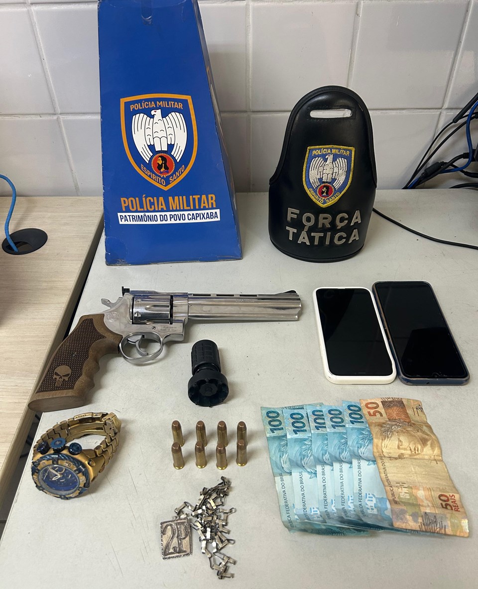 Durante a busca no interior do automóvel, foi encontrado um revólver calibre 38, oito munições do mesmo calibre, um jet loader, dois aparelhos celulares, e a quantia de R$ 550,00 em espécie.
