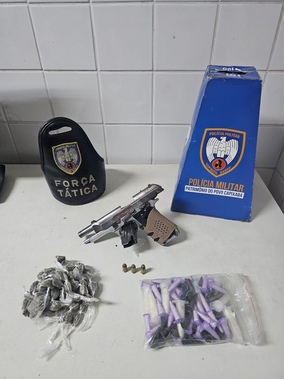 Nessa quarta-feira (15), a Força Tática do 6º BPM realizou a apreensão de uma arma de fogo e entorpecentes na Serra.