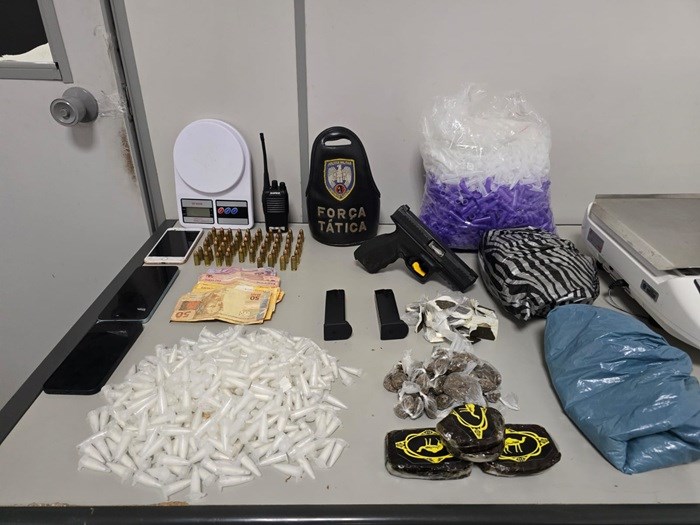 Na ação, foram apreendidos uma pistola calibre 9mm com numeração raspada, dois carregadores sobressalentes, 54 munições calibre 9mm, três munições calibre .40 e uma munição calibre .380, além de aproximadamente 1,2kg de maconha em porção única e outras 37 buchas da mesma substância, porções e unidades de haxixe totalizando mais de 300g, uma porção de cocaína com cerca de 405g e 420 pinos da mesma substância, somando aproximadamente 575g.