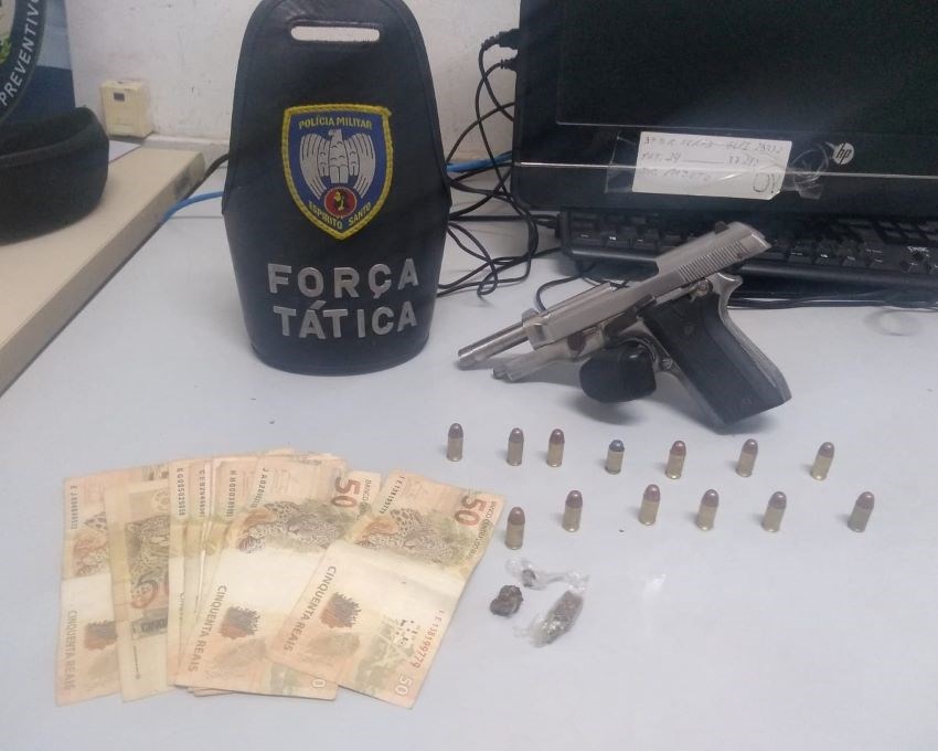 Durante patrulhamento tático pelo bairro Santo Antônio, militares da Força Tática visualizaram dois indivíduos próximos a um campo de futebol e esses percebendo a aproximação das viaturas tentaram fugir. Rapidamente os suspeitos foram abordados, sendo com eles encontrada uma pistola calibre .380 municiada, R$550,00 em espécie e duas buchas de maconha.