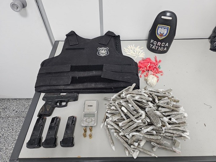 Em outra ação, dessa vez no bairro Santo Antônio, militares receberam a informação pelo Disque Denúncia 181 de que um indivíduo estaria traficando entorpecentes em determinado endereço. Prontamente as equipes prosseguiram ao local e obtiveram êxito em abordar o suspeito, sendo com ele encontrada e aprendida uma pistola calibre .40, munições, 200 buchas de maconha, 91 pedras de crack, 26 pinos de cocaína, além de um colete balístico.