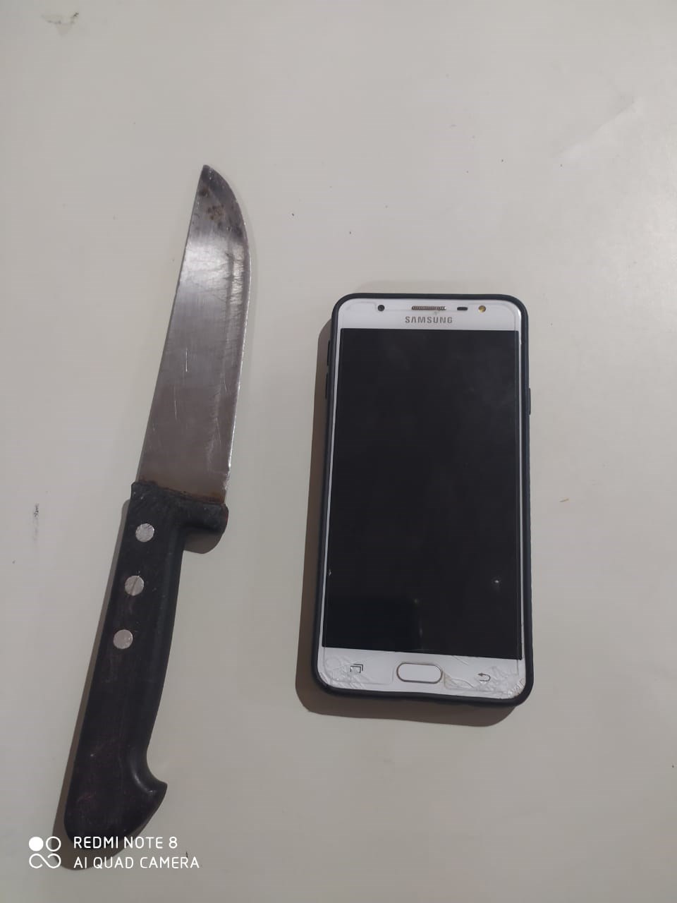 Durante patrulhamento, a equipe de serviço foi acionada por uma vítima de roubo. Um senhor informou que acabara de ser assaltado em Jardim Camburi por um homem que portava uma arma branca. Os militares informaram no rádio as características passadas pela vítima e iniciou as buscas no setor. Na avenida Norte Sul, foi avistado um homem que atendia as características mencionadas e após abordagem e busca minuciosa, foram encontrados o celular roubado e a arma utilizada na prática do delito.