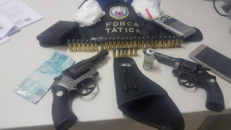 No interior da residência de C.V.C., de 30 anos, foi localizado um revólver calibre 38, municiado com seis munições. Dando continuidade às buscas, foi encontrado um revólver calibre 32, e mais 27 munições, dentro de um armário. Também foi encontrada uma sacola contendo cocaína, uma granada de fabricação caseira, uma balança de precisão, um aparelho celular e R$100,00 em espécie.
