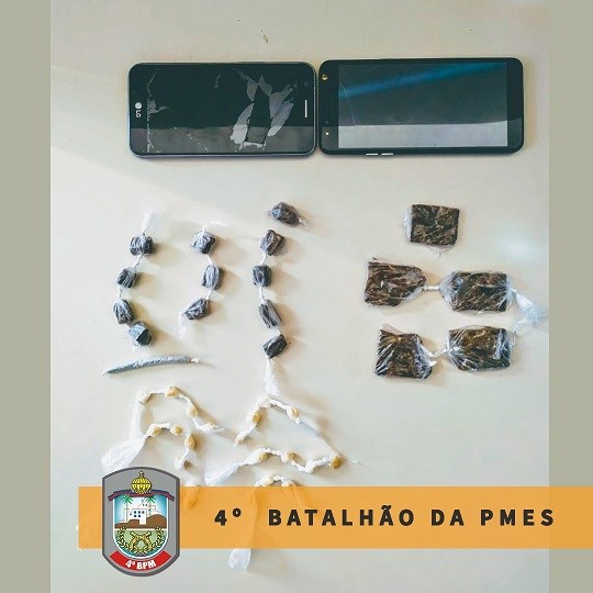 O jovem, que está desempregado e mora no bairro Castelo Branco, em Cariacica, não explicou o motivo de estar no local. Nas buscas pelas proximidades foi encontrada uma sacola com 24 pedras de crack embaladas para a venda, 12 buchas embrulhadas de maconha, cinco pedaços maiores da mesma droga, além de dois celulares.