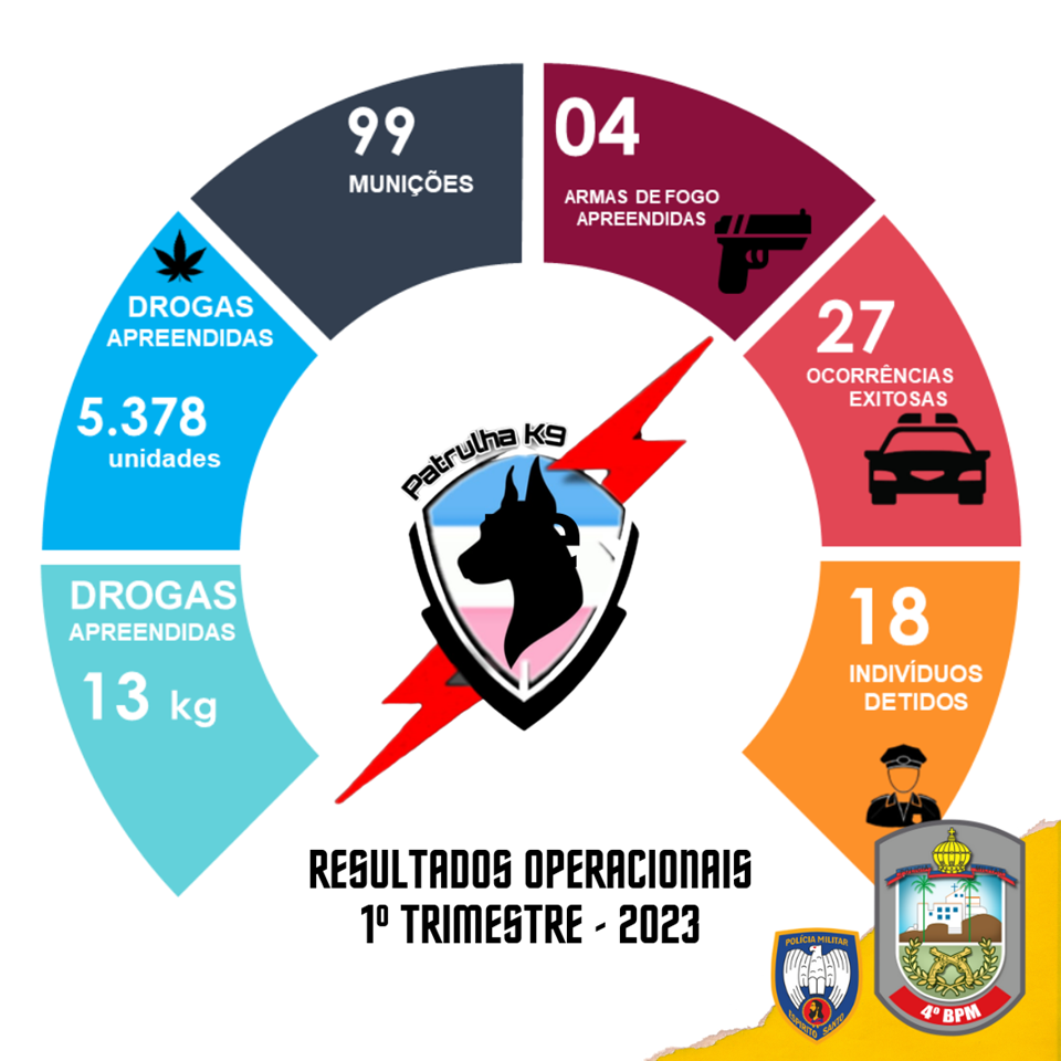 Na manhã de hoje (27), a equipe K9 do 4º Batalhão disponibilizou os dados estatísticos referentes às ocorrências em que tiveram participação no primeiro trimestre de 2023.