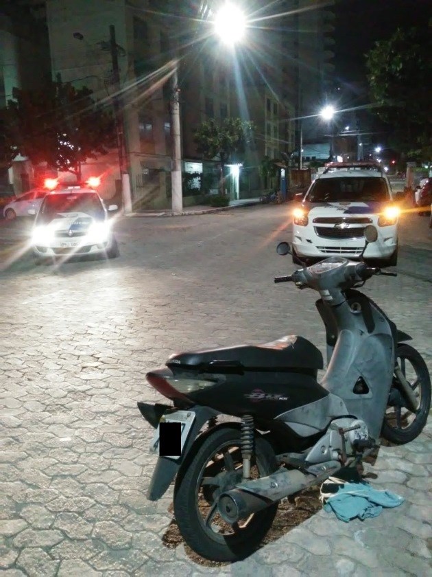 No caminho para o local do fato a viatura se deparou com os indivíduos a bordo da motocicleta Honda Biz de cor preta, vindo a efetuar a devida abordagem policial. Foi constatado que o veículo possui restrição de furto e roubo e que ambos os envolvidos são menores de idade.