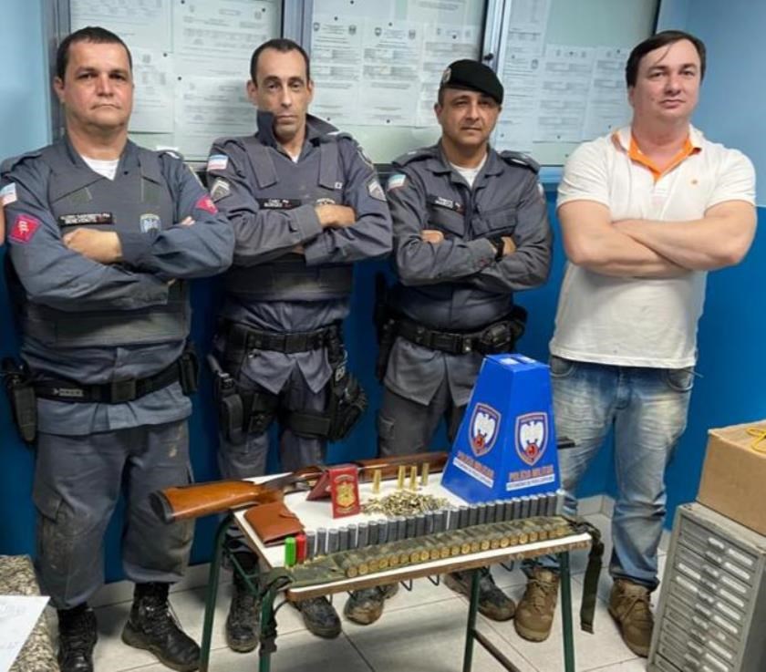 Após realizar buscas em uma área de mata, os policiais localizaram um acampamento e apreenderam uma espingarda calibre 12, um cinturão com capacidade para 22 cartuchos e 242 munições.