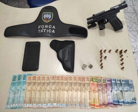O criminoso foi surpreendido portando dois tabletes de maconha, além de estar portando, em sua cintura, uma arma de fogo, revólver calibre 38 com numeração raspada, municiado com quatro munições calibre 38 intactas. Ainda foram encontrados no recinto uma balança de precisão, porções de maconha, crack e cocaína armazenadas em uma sacola plástica que estava embaixo do travesseiro de uma criança, filho de uma mulher que estava no endereço.