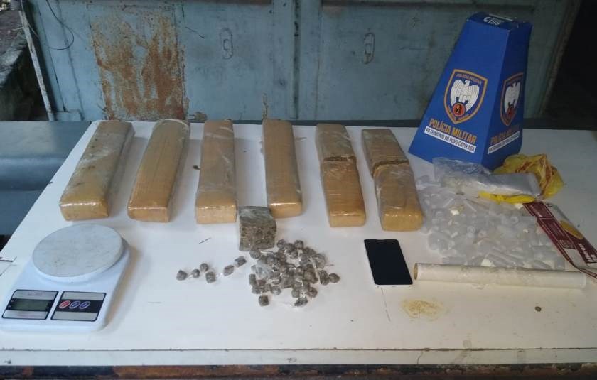 No interior do imóvel alvo da denúncia foram apreendidos seis tabletes de maconha com 1,250kg cada, totalizando 7,5kg da droga, além de material para embalo. No telhado também foram recolhidas 62 buchas de maconha.