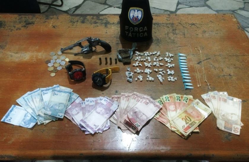 No lugar em que estavam quando foram avistados os militares encontraram mais R$ 792,60 em dinheiro, 84 pedras de crack, uma bucha e um pacote com aproximadamente 30 gramas de maconha, 12 pinos de cocaína e um revólver calibre .32 carregado com quatro munições intactas do mesmo calibre.
