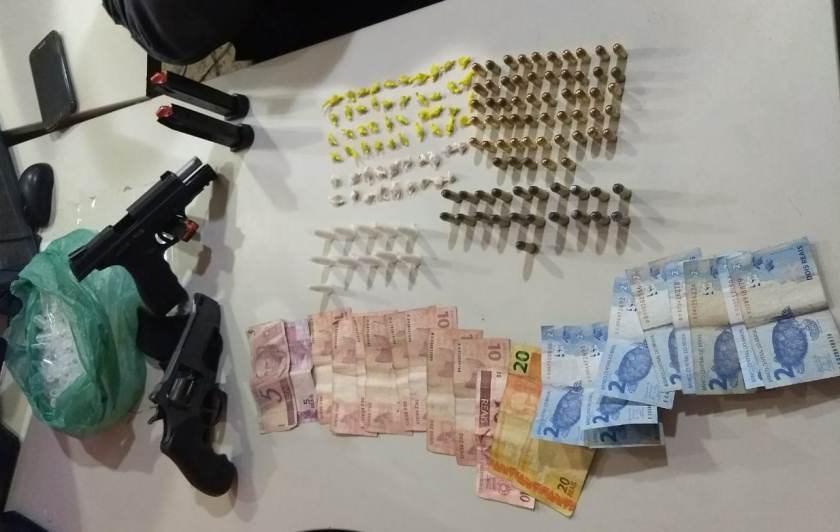 Somente na noite de quinta-feira (31), no patrulhamento realizado no bairro Romão, foram apreendidos uma pistola Taurus 838, um revólver Jaguar calibre 38, três carregadores de pistola, 55 munições calibre 380, 21 munições calibre 38, 59 pedras de crack, 11 pinos de cocaína, um coldre, R$160,00 em espécie e material para embalo de entorpecentes.