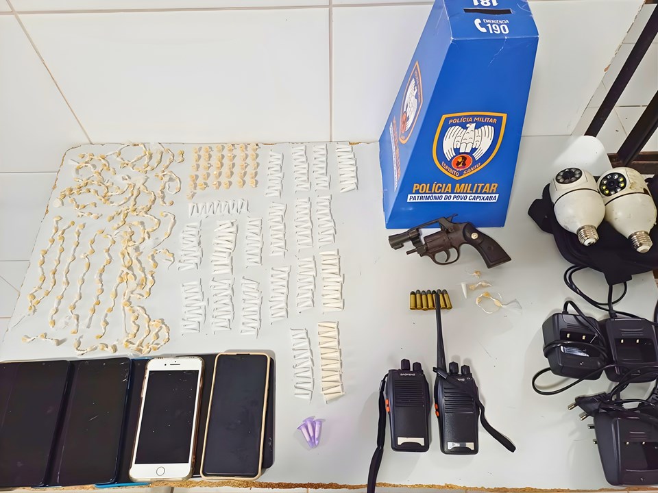 Durante as buscas, também foram apreendidos um revólver calibre .32 carregado com seis munições intactas, uma munição adicional do mesmo calibre, nove aparelhos celulares, dois rádios comunicadores com três carregadores e duas câmeras de vigilância.