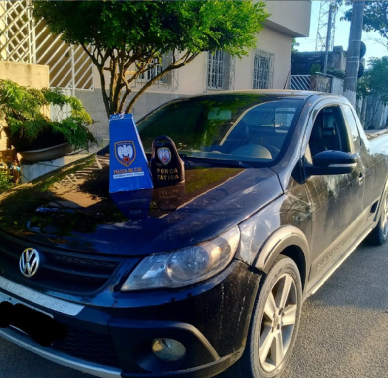 Já na localidade de Praia das Neves, em Presidente Kennedy, os policiais visualizaram três suspeitos a bordo de um Saveiro Cross de cor preta e abordaram o veículo. O carro possuía documentos aparentemente falsificados. Foram realizadas consultas minuciosas e constatado que se tratava de um carro clonado com restrição de furto/roubo.