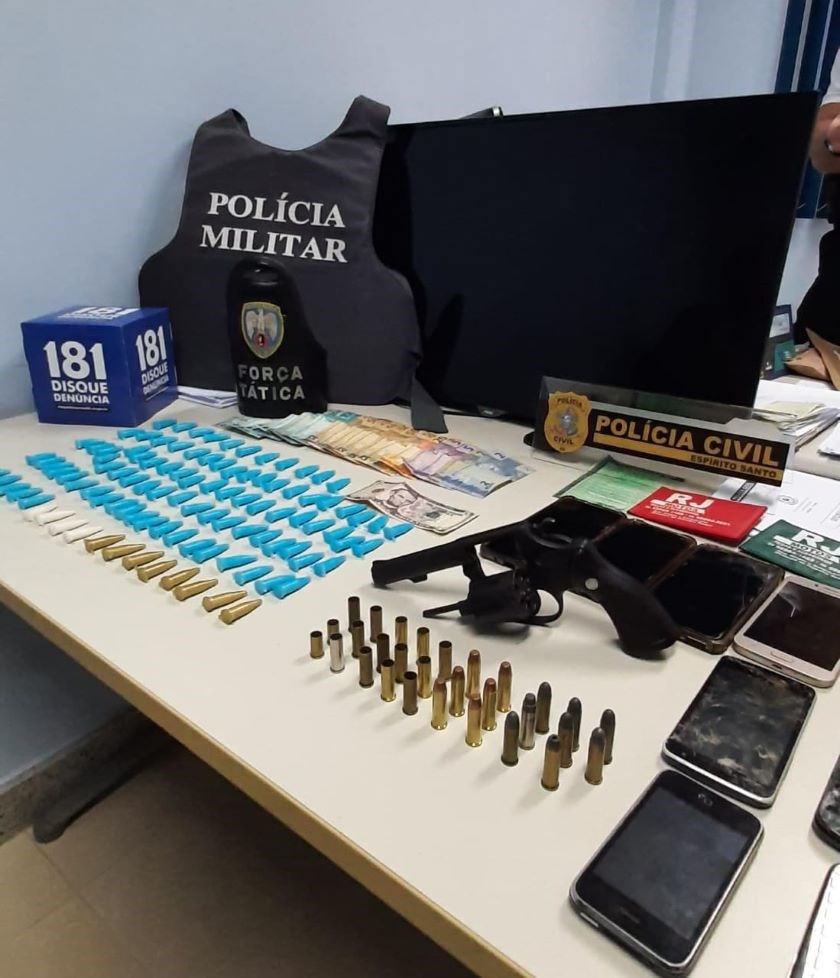 Os policiais localizaram no veículo de um dos suspeitos no Bairro Vale do Sol, um revólver calibre 38, 14 munições calibre 38, 15 cápsulas, 101 pinos de cocaína, R$984,00, $5,00 dólares, nove celulares e uma TV 32 polegadas.