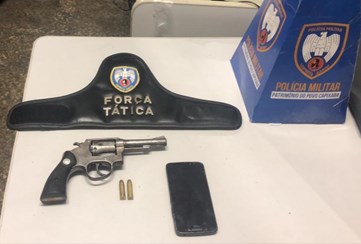Já no bairro Novo Jequitibá, em Aracruz, a equipe da Força Tática avistou dois suspeitos em frente a uma residência e um deles estava com uma arma de fogo em mãos. Eles fugiram para dentro da casa ao ver a guarnição. Em certo momento foi visto quando o suspeito arremessou a arma em um quintal vizinho. Os militares fizeram a abordagem e posteriormente a arma de fogo foi localizada, se tratando de um revólver calibre 38, com duas munições de mesmo calibre.