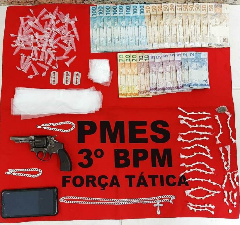Os militares encontraram no local denunciado, 99 pedras de crack, fracionadas e embaladas prontas para venda, uma bucha de maconha, 49 pinos vazios comumente utilizados para armazenar pequenas porções de cocaína, a quantia de R$ 1.434,00 e um revólver calibre 32mm.
