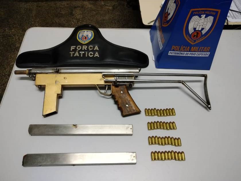 Durante patrulhamento no distrito de Barra do Riacho, a equipe da Força Tática recebeu denúncias de que havia um indivíduo de posse de um objeto aparentando ser uma arma de fogo, próximo ao cemitério. Diante das informações, foi realizado patrulhamento na localidade informada e observado quando um rapaz adentrou em um beco. Diante da fundada suspeita, os militares fizeram o acompanhamento e abordaram o menor K.G.S., 14 anos. No local, foi encontrada uma bolsa contendo um carregador de metralhadora com 18 munições de calibre 380. Após realizarem buscas nas proximidades, foi localizada uma metralhadora de fabricação caseira carregada com mais 21 munições.