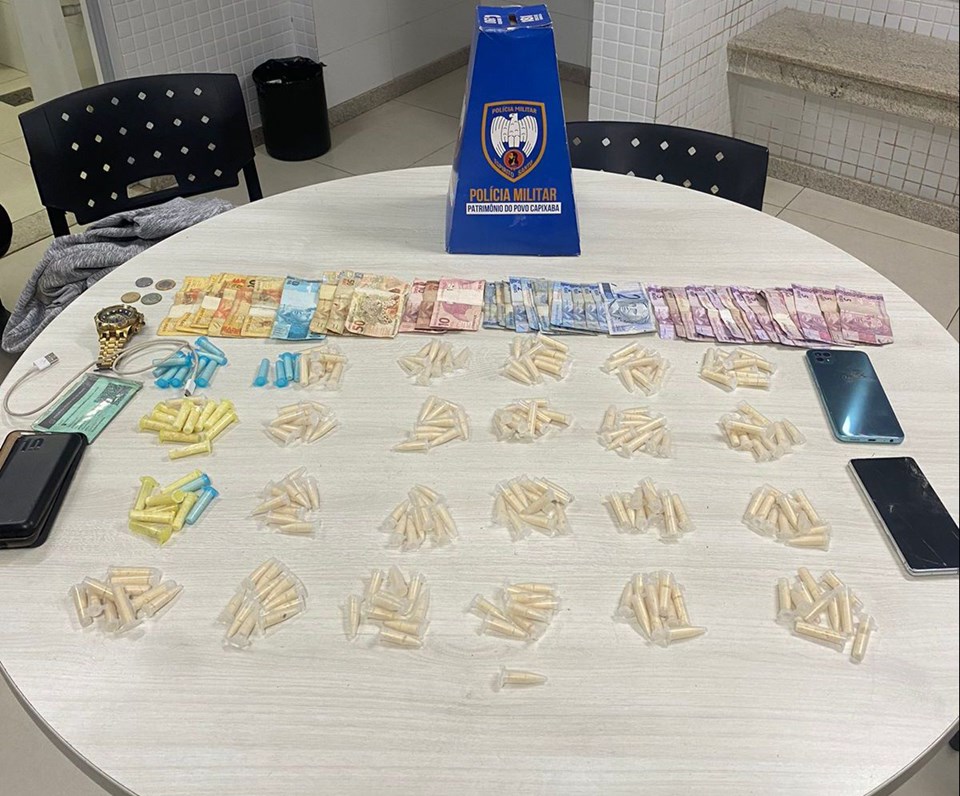 Os dois criminosos foram identificados, sendo o “Dentinho”, um dos mais procurados do município de Cariacica e o “Menor Nicolas”. Com “Dentinho” os policiais localizaram uma bolsa, a qual continha 240 pinos de cocaína e R$520,75 em espécie.