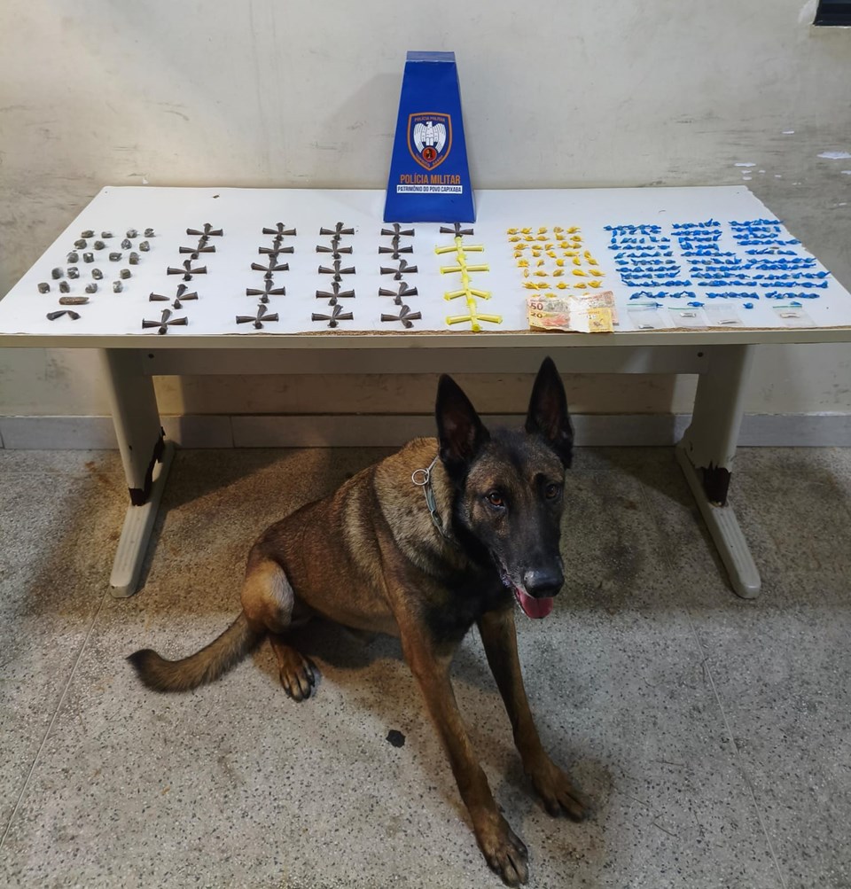 No sábado (11), durante patrulhamento no bairro Santa Mônica, os militares abordaram um indivíduo e durante a busca pessoal foram encontrados 10 pinos de cocaína, 10 buchas de maconha, 10 pedras de crack, 04 papelotes de haxixe e R$120,00. Com o auxílio do cão policial Lobo, a equipe realizou varredura nas proximidades, localizando mais 92 pinos de cocaína, 11 buchas de maconha e 177 pedras de crack.