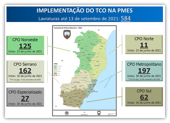 A lavratura do TCO por policiais militares foi implementada inicialmente no mês de novembro de 2020, após meses de estudo, como projeto piloto na 6ª Companhia Independente (Domingos Martins) e 12ª Companhia Independente (Jardim Camburi). Desde então, passou por diversos ajustes e expandiu-se de forma escalonada, em junho deste ano, a todos os Comandos de Polícia Ostensiva, colocando a Corporação entre aquelas do país que o efetivaram em sua totalidade.