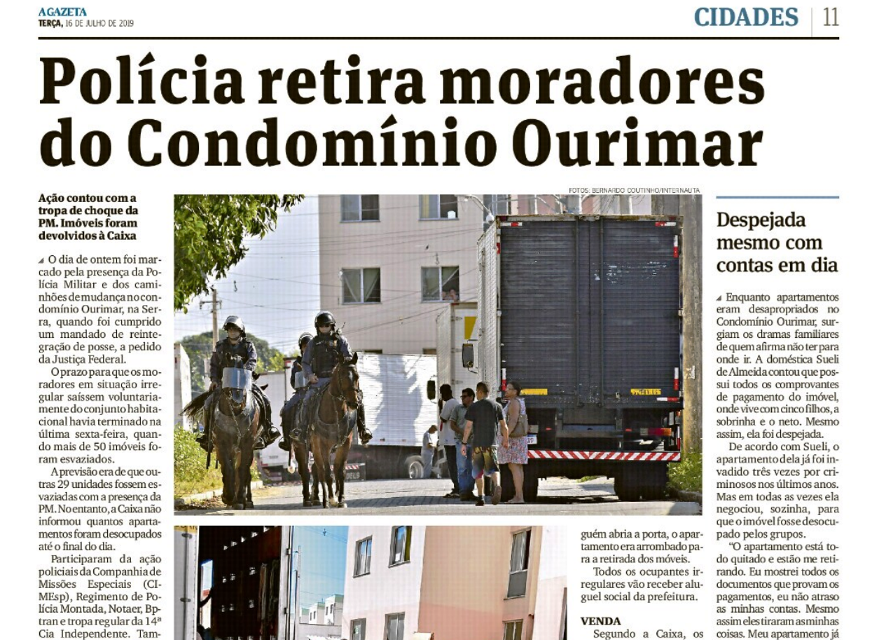A Polícia Militar do Espírito Santo esclarece que, na reintegração de posse de apartamentos do condomínio Ourimar, no município de Serra, na manhã de segunda-feira (15), atuou em apoio à Justiça Federal; ao contrário do título que fora estampado na página 11 do jornal A Gazeta desta terça-feira (16), que transmite a errônea compreensão de que a Instituição foi a responsável pela retirada de famílias moradoras do local.