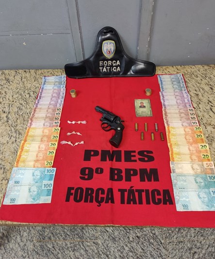 Ainda na sexta-feira, policiais avistaram um indivíduo em frente a uma casa com uma arma de fogo, sendo um revólver calibre. 38, municiado com seis munições, cinco deflagradas e uma intacta. Também foram apreendidos R$ 802,00 e nove pedras de crack.