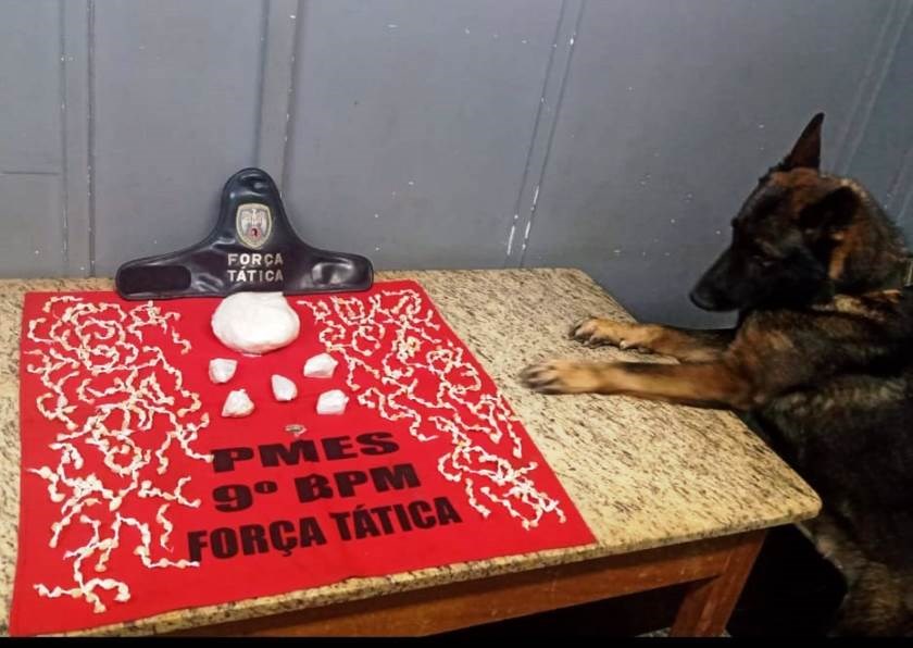 Após informações do Serviço de Inteligência acerca de suspeitos estocando drogas em uma obra no Bairro Campo Leopoldina, policiais militares com a ajuda do cão Messi encontraram uma sacola contendo 585 pedras de crack, cinco pedras maiores, num total de 150 gramas da mesma substância, um tablete de 500 gramas de cocaína e uma bucha de maconha.