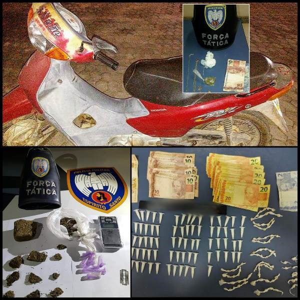Já por volta das 20h00min, ato contínuo a ocorrência da moto recuperada, horas antes, os militares da Força Tática deslocaram até o bairro Vila Alta em Alegre-ES, pois, segundo denúncias na residência de um dos suspeitos flagrados teria mais entorpecentes.