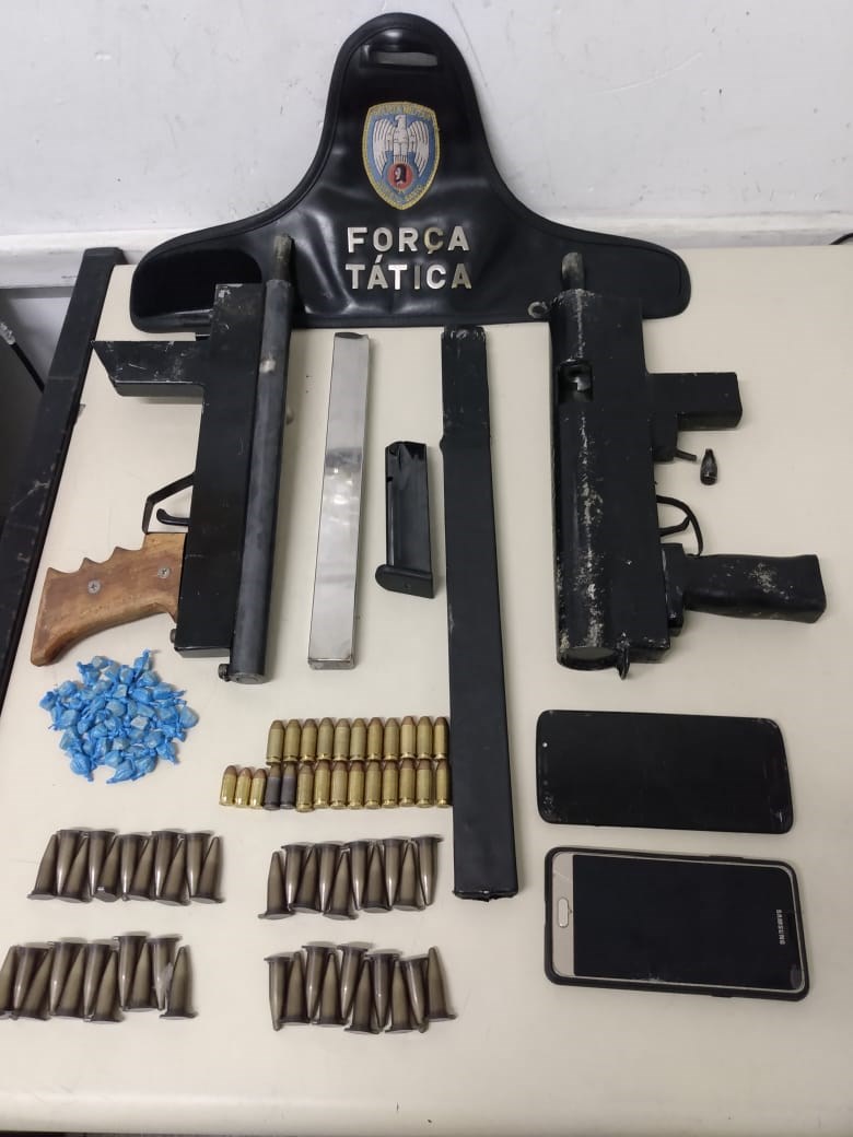 Os militares prenderam dois suspeitos e com eles apreenderam uma metralhadora calibre 40, uma metralhadora calibre 380, 20 munições calibre 40, duas munições calibre 9 mm, três munições calibre 380, além de 42 pedras de crack e 42 pinos de cocaína.