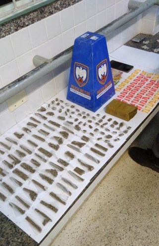 Na noite desta quinta-feira (21), por volta de 19h07min, militares do patrulhamento tático, em averiguação a denúncia de tráfico de drogas avistaram dois indivíduos em um barracão abandonado no bairro Coroado. Os homens empreenderam fuga pelos fundos, sendo um deles abordado em outra casa abandonada, em sua posse foi encontrado cinquenta pedras de crack e nove pinos de cocaína. Com o apoio de mais alguns militares e do K9, cão policial Mike, foram localizados dentro do barracão, um tablete e mais cento e quinze buchas de maconha, cem pinos de cocaína, noventa pedras de crack, duas balanças de precisão, e diversos materiais utilizados para embalo de drogas.