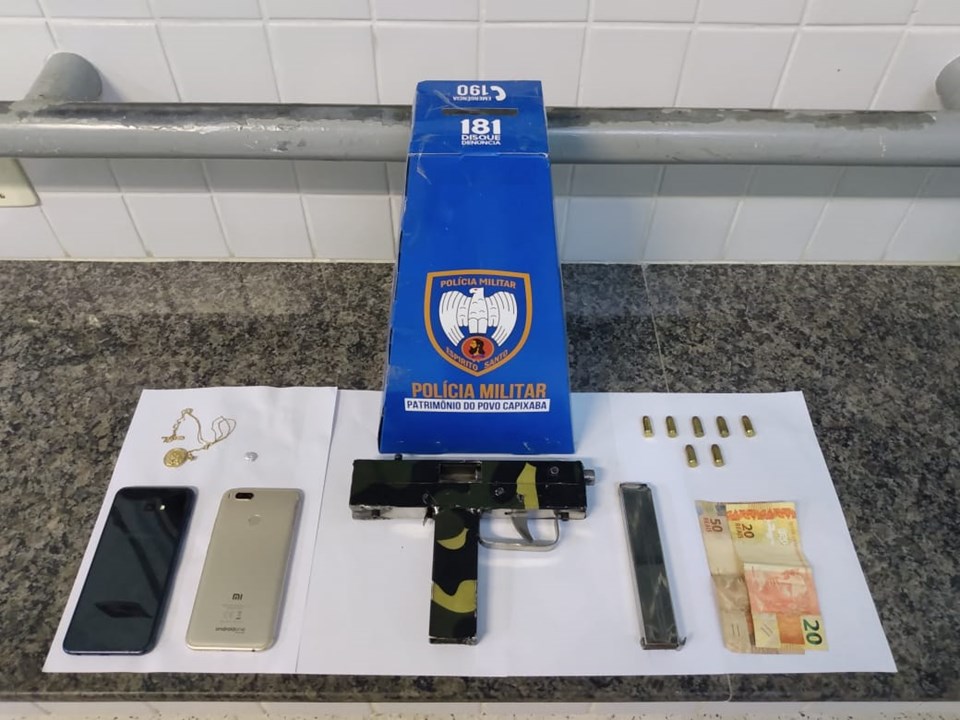 Ainda durante esta noite, por volta de 23h51min, equipes do patrulhamento tático do 10º Batalhão, abordaram um homem que estava dentro de um veículo parado no bairro Centro. Em sua posse foi encontrado uma submetralhadora de fabricação artesanal de calibre 380, carregada com sete munições do mesmo calibre, uma pedra de crack e R$ 70,00 em espécie. A mãe do detido em contato com os militares, informou que seu filho seria usuário de drogas.
