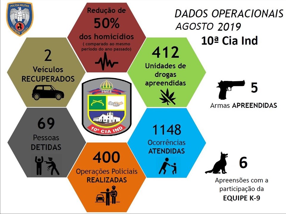 Para estes resultados, destaca-se a participação dos policiais militares da 10ª Cia Ind, desde os que realizam o policiamento ostensivo em viaturas, até os militares da administração, que se empenham para prover meios para a atividade fim, bem como o comprometimento do serviço de inteligência e Equipe K-9.