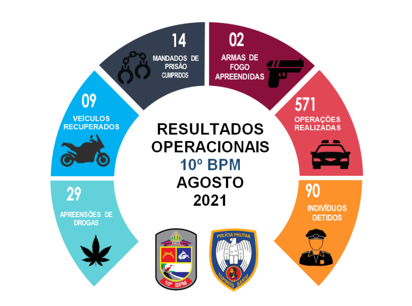 O 10º Batalhão da Polícia Militar, com sede em Guarapari, divulgou nessa quarta-feira (1º) os resultados operacionais obtidos durante todo o mês de agosto. Ocorrências como: apreensão de armas de fogo (02), veículos recuperados (09), mandados de prisão cumpridos (14) e apreensão de drogas (29).