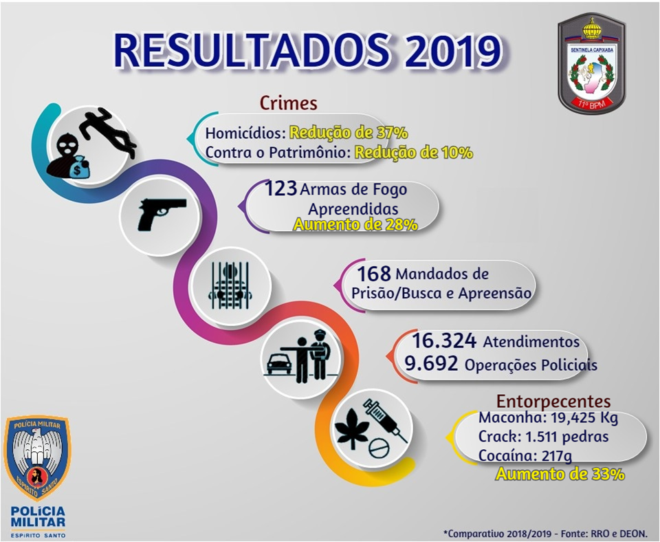 O 11º Batalhão da Polícia Militar divulgou, nesta quarta-feira (22), os resultados alcançados pela Unidade Operacional em 2019. Os dados compreendem os municípios de Barra de São Francisco, Água Doce do Norte, Ecoporanga, Águia Branca e Mantenópolis.