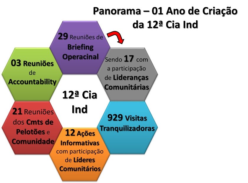 De 1º de março de 2017 a 28 de fevereiro de 2018 foram realizadas três reuniões de accountability do Comandante da Companhia junto aos líderes comunitários para explanação do balanço das operações, apreensões e análise do policiamento e 29 reuniões de briefing operacional, sendo 17 com a participação de líderes comunitários. O briefing é uma reunião semanal para análise dos principais crimes da área atendida pela Companhia e para explanação da distribuição de policiamento, sendo que quando a liderança comunitária está presente na reunião ela pode opinar sobre as questões do seu bairro. Também foram realizadas 21 reuniões dos Comandantes de pelotões com as lideranças comunitárias dos seus setores para melhor emprego do policiamento; 12 ações informativas com panfletagem juntamente com os líderes comunitários; e 929 visitas tranquilizadoras nos comércios da região.