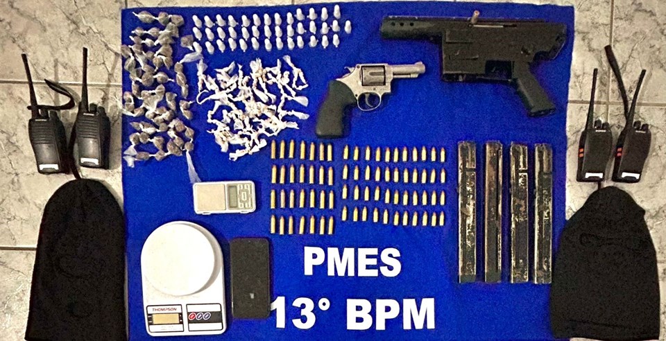 Ao verificar o conteúdo da mochila, os policiais encontraram um revólver calibre 38 da marca com seis munições intactas, uma submetralhadora calibre 9mm, quatro carregadores, 44 munições calibre 9mm, 28 munições calibre 38, quatro rádios HT, duas toucas ninja e um aparelho celular.