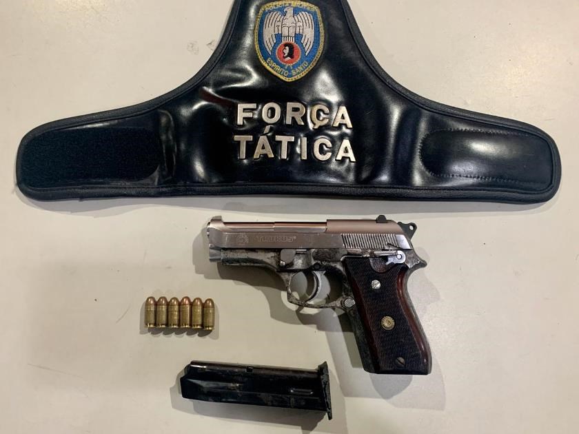 Já no bairro Cabral, militares da força tática que realizavam patrulhamento a pé avistaram aproximadamente seis indivíduos armados. Um deles deixou cair uma pistola marca Taurus, modelo 58ss, calibre 380 com seis munições intactas em seu carregador.