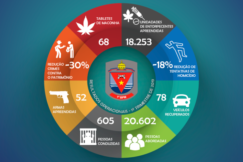 No período compreendido entre 1º de janeiro e 31 de março, foram realizadas na área do 1º BPM, um total de 797 operações policiais, dentre abordagens a veículos diversos e transeuntes, sendo abordadas 20.602 pessoas, 605 indivíduos detidos em flagrante delito e um total de 78 veículos com restrição de furto/roubo recuperados.