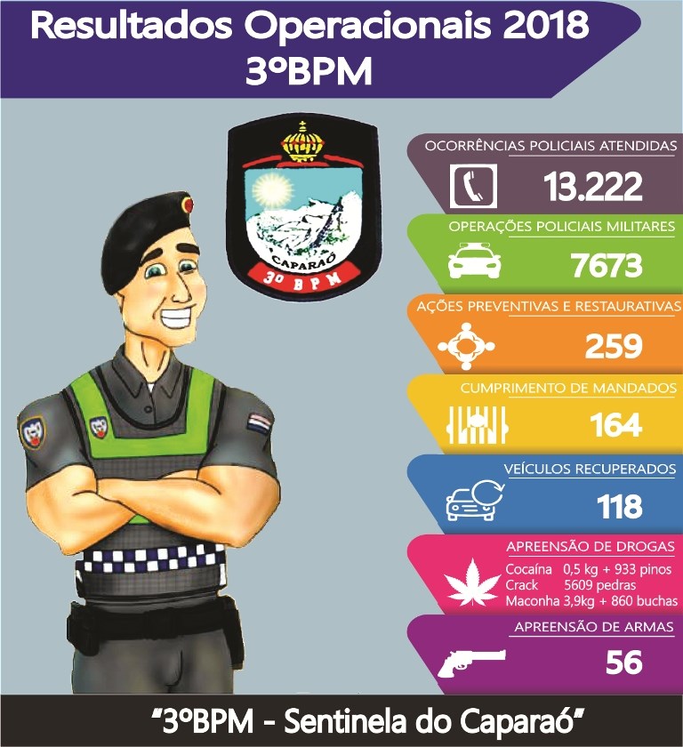 O comandante do 3º Batalhão, tenente-coronel Caus, registra que os valorosos militares estaduais da Unidade encerraram o ano de 2018 com a missão cumprida. Mais uma vez a Unidade apresenta grandes resultados na sua área de atuação que só puderam ser alcançados graças à perseverança desses policiais militares.