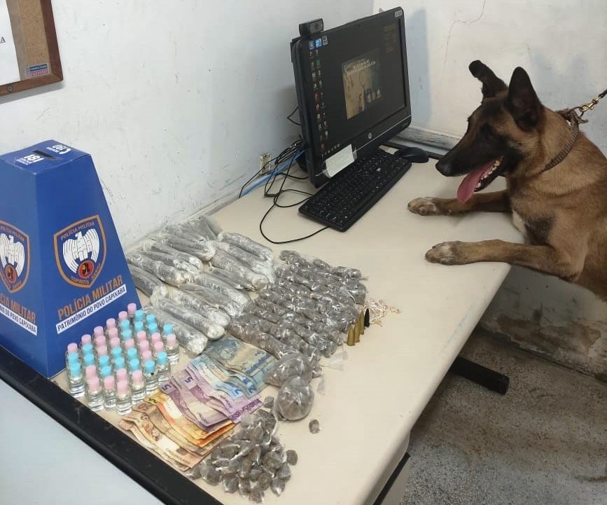 Durante a verificação de um Disque-Denúncia no bairro Nova Carapina I, dando conta de que suspeitos estariam traficando entorpecentes na região, militares foram ao endereço informado e com apoio do cão farejador Apollo conseguiram encontrar 508 buchas de maconha, 42 frascos de loló, 22 pedras de crack, seis pinos de cocaína e R$272,00 em espécie.