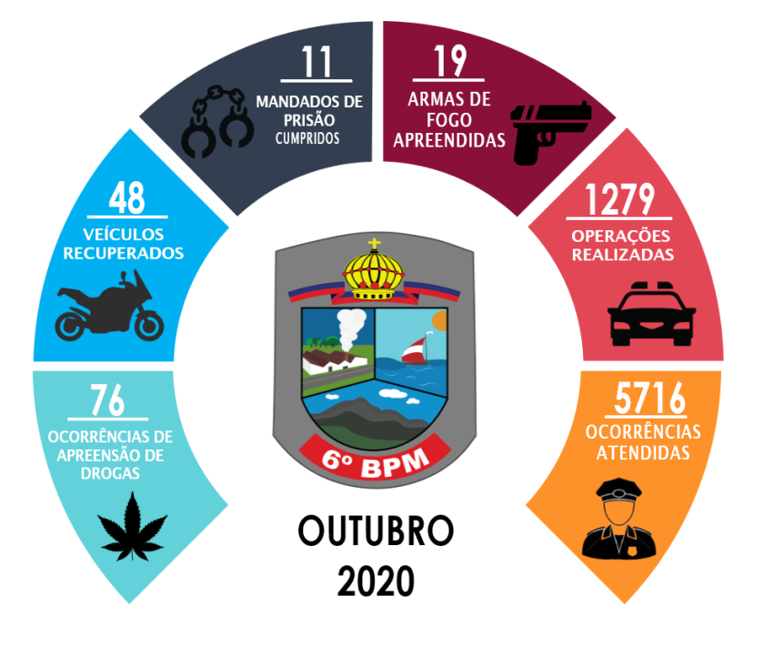Nesta terça-feira (03), o 6º Batalhão divulgou os resultados operacionais obtidos no mês de outubro. No total, foram atendidas 5.716 ocorrências e 1.279 operações foram realizadas no âmbito da Unidade. Dessas, 76 resultaram em apreensão de entorpecentes e 11 em mandados de prisão cumpridos. Além disso, as equipes obtiveram êxito em apreender 19 armas de fogo e recuperar 48 veículos com restrição de furto ou roubo.