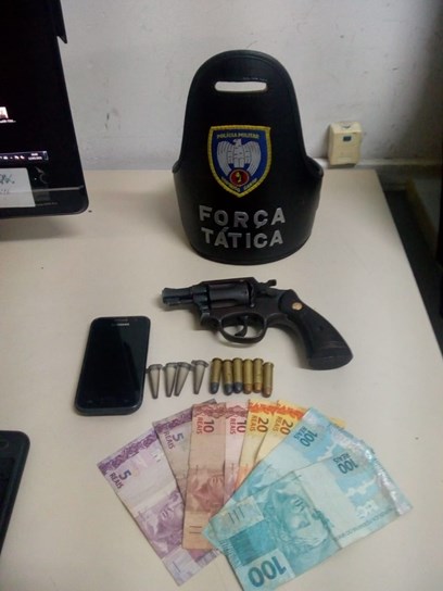 No bairro Santo Antônio, militares da Força Tática avistaram um indivíduo que ao perceber a presença policial tentou fugir, porém, não obteve êxito. Com o suspeito foi encontrado um revólver calibre 38 com 06 munições, além de 04 pinos de cocaína e R$ 270,00 em espécie.